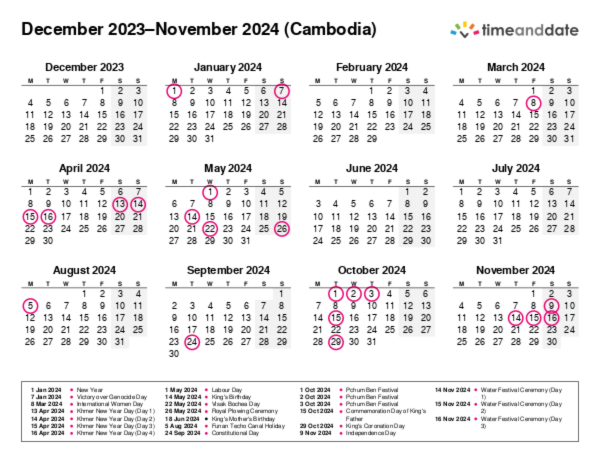 Calendar 2024 Khmer May. The sunrise and sunset are calculated from New York. Date Calculator – Add or subtract days, months, years; Countdown to. In Khmer, it is called 'Chaul Chnam Thmey', which means 'enter the new year'. Khmer New Year, also known as Cambodian New Year is usually a three-day public holiday in Cambodia. It is a constitutional monarchy with Buddhism being the dominant religion. In the table below, you will find the details of the holidays and when they are observed. This is reflected in its public holidays with many being focused on the monarchy or Buddhism. All the information display below is also available via our API as well as downloadable as a csv.